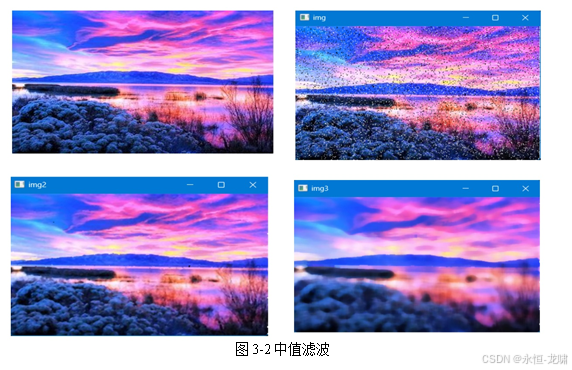 2.使用中值滤波测试结果如图3-2所示,其中左上为原图,img为添加椒盐噪声图,img2为3*3卷积核滤波,img3为5*5卷积核滤波