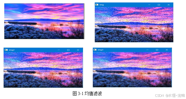 1.使用均值滤波测试结果如图3-1所示,其中左上为原图,img为添加椒盐噪声图,img2为33卷积核滤波,img3为55卷积核滤波