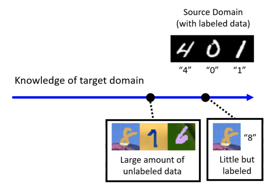 若要将模型用在不一样的领域上,在训练时就必须要对另外一个领域也就是测试资料所在的目标领域有所了解,随着了解的不同我们就会有不同的领域自适应方法。