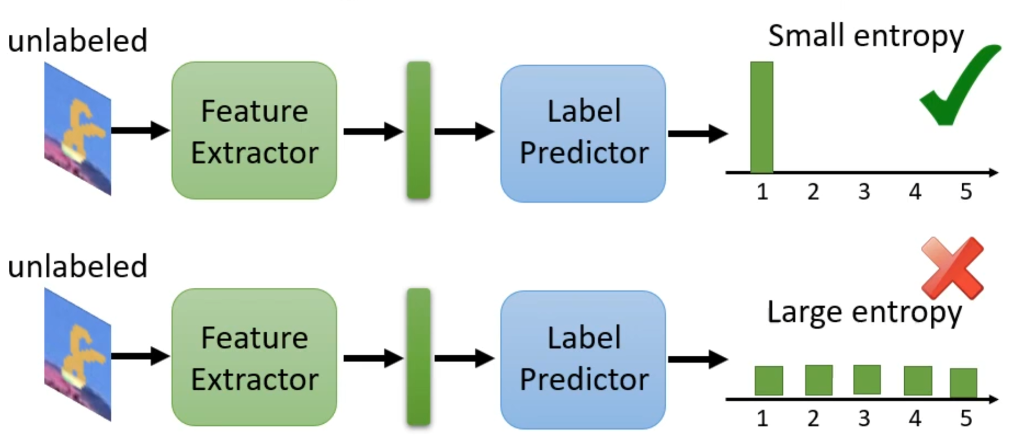 为了让方形远离分界线,可以用一个最简单的方法,就是现在有一堆没有标签的资料经过前面的分类器得到的结果尽可能集中这样就离分界线越远,若结果每一个类别都非常接近就表示离分界线越近。