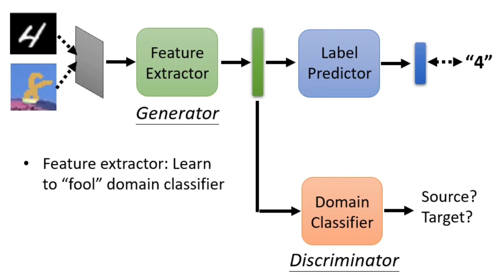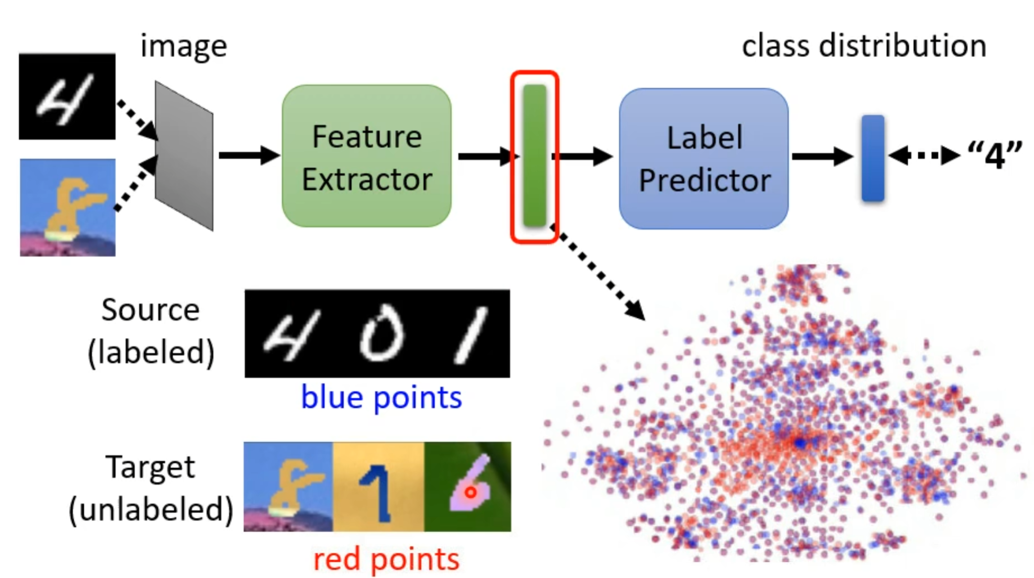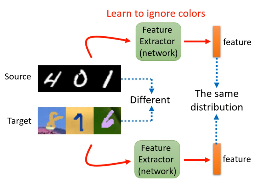 就如上图,为了使得蓝点与红点之间分不出差异就要用到领域对抗训练技术(Domain Adversarial Training)。就是再训练一个领域分类器,其输入是特征提取器输出的向量,并对这向量进行判断是来自源领域还是目标领域。而特征提取器的学习目标就是要骗过领域分类器。