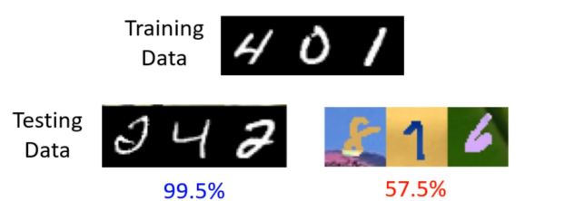 所以像数字辨识这么简单的问题,在基准语料库(Benchmark Corpus)上实现正确率就可以达到99.5%,但是假设现在测试资料与训练资料的分布不一样这时得到的正确率就会非常低,只有57.5%。