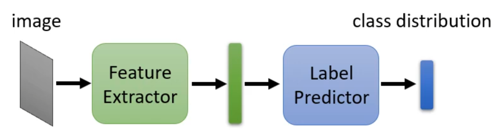 现在的问题就转为如何找出这样的特征提取器,对此我们可以将一个一般的分类器分成特征提取器和标签预测器(Label Predictor)两个部分。就如图像分类器其就是输入一张图片然后输出其分类结果,若其有十层,我们可以假设前五层为特征提取器后五层为标签预测器。