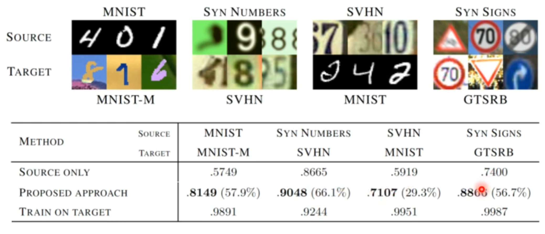 我们可以看到图片中上半部分是源领域的图片,下半部分是目标领域的图片。如果是拿目标领域中的图片进行训练,源领域中图片作为测试则结果是表格中最后一行,每个任务正确率都有90%以上,若反过来则最后的正确率就掉了很多,也就是表格中的第一行。但是做了领域对抗训练之后正确率就会有所提升,也就是表格中的第二行。