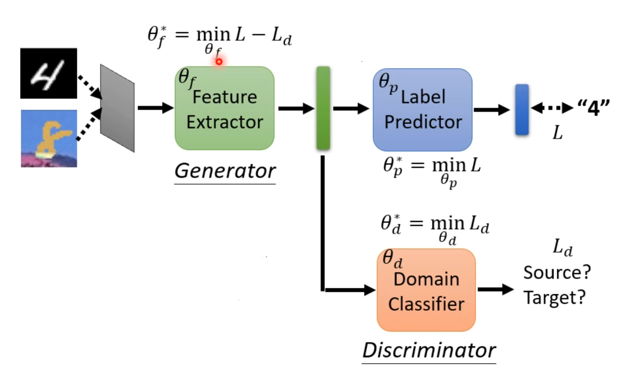 现在再用符号进行表示,令标签预测器参数为θp,领域分类器参数为θd,特征提取器参数为θf。对应前面内容就是如下图: