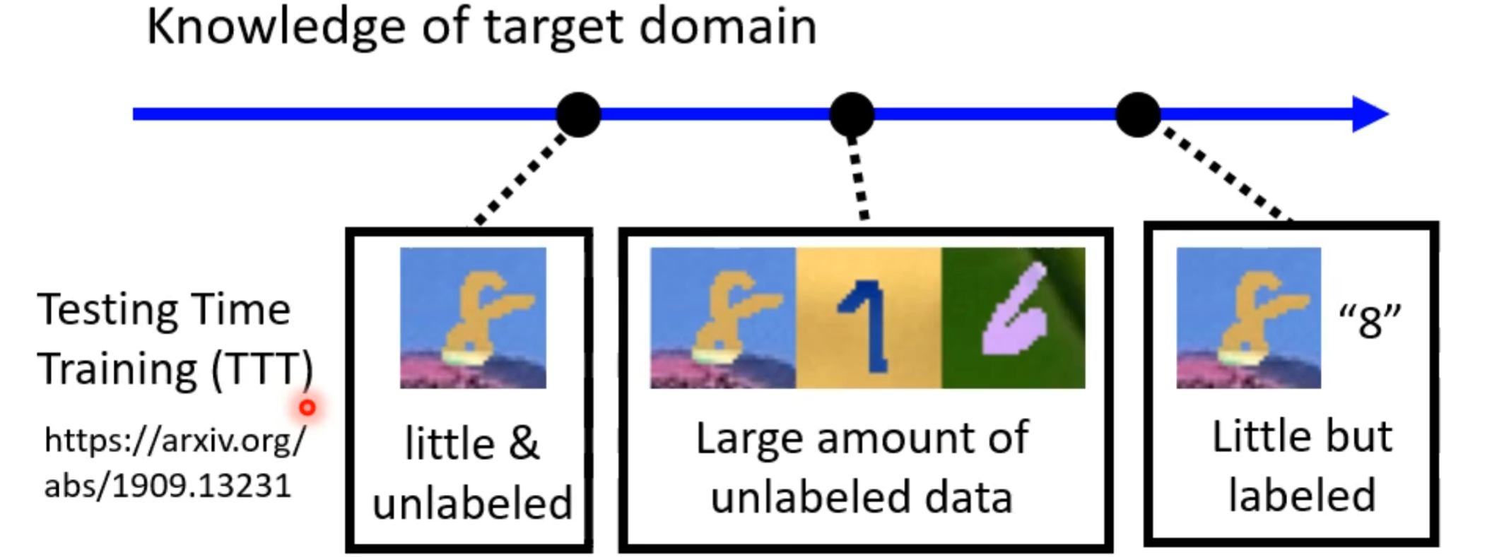 接着还有一个更严重的问题,前面说有一大堆没有标签的资料,若是现在目标领域不止没有标签而且资料只有一点。这也不是没有方法可以解决,可以使用测试时训练方法(Testing Time Training,TTT)。