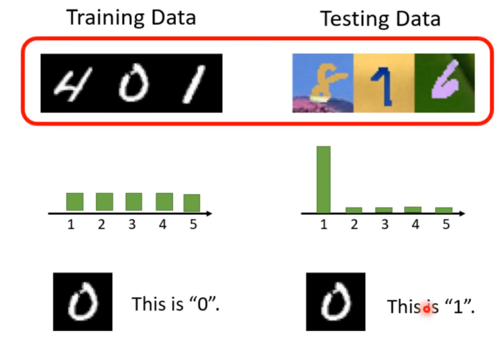 而这种训练资料与测试资料分布不一样的情况就称为领域偏移(Domain Shift)。因为在正常情况下训练资料与测试资料的分布是一样的,这就会导致模型正确率很高的错觉。而在实际上用在真实应用上时,当测试资料与训练资料有一点差异时模型能不能做的好就是未知数了。