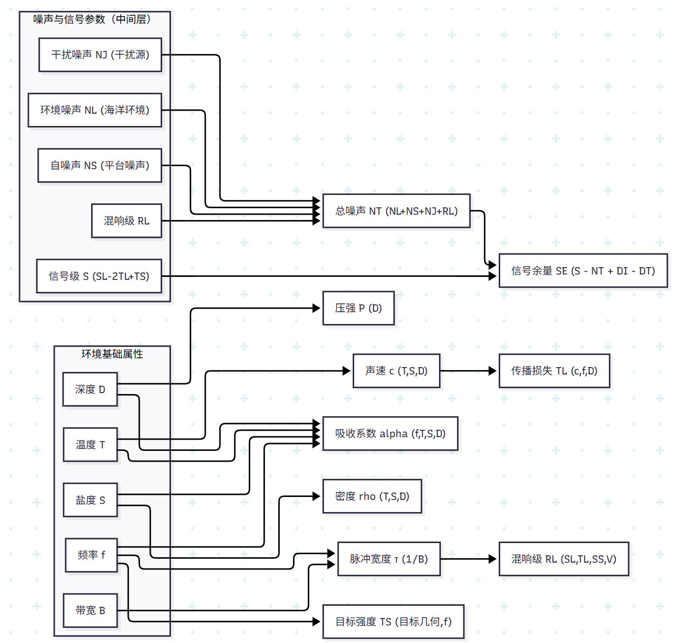 A --> F["声速 c (T,S,D)"] & K["吸收系数 alpha (f,T,S,D)"]