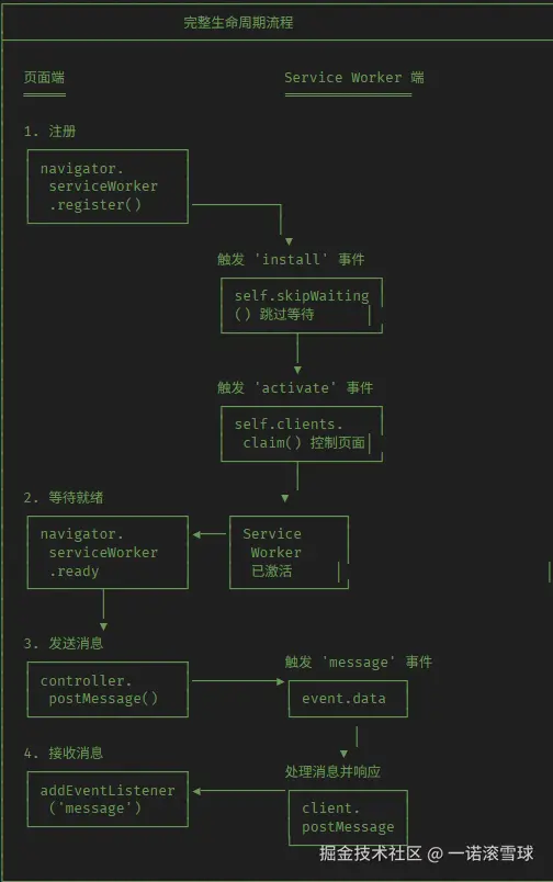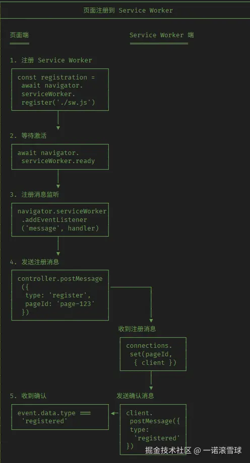 navigator.serviceWorker.register()注册ServiceWorker脚本,浏览器启动后台线程并执行脚本,触发install和activate事件,此时ServiceWorker进入激活状态,具备通讯能力。 - 页面连接建立 :每个页面在ServiceWorker激活后,可通过