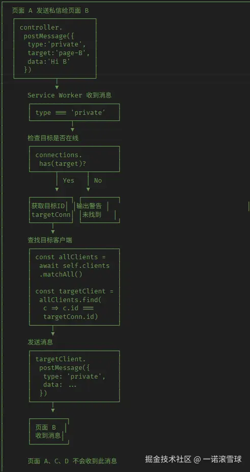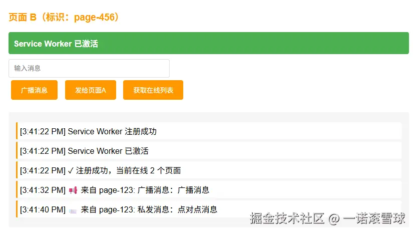 实现需求:同一域名下的pageA、pageB两个页面,通过ServiceWorker实现"点对点消息"和"全局广播消息"两种通讯模式。