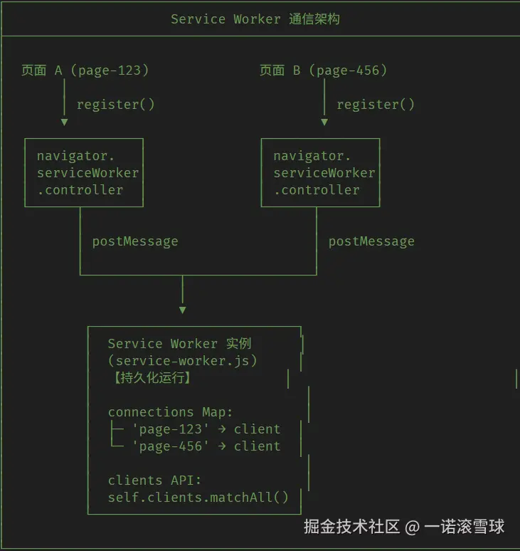 这些特性也是其实现跨页面通讯的基础,简单来说,ServiceWorker就像一个"驻留在浏览器中的微型服务端",多个页面可通过它建立通讯连接,实现数据共享与消息传递,甚至在页面离线时完成特定交互。