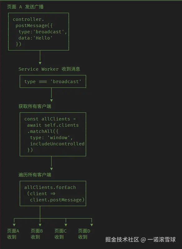 ServiceWorker的跨页面通讯核心是"中心化消息枢纽"模式,依托其"单例运行+多页面连接管理"的特性实现,具体流程可分为三个阶段: