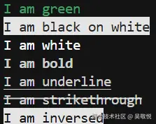 color文字颜色,可以是英文单词,也可以是十六进制的颜色值,只能输入#rgb或#rrggbb,还可以设置rgb(255, 0, 255);backgroundColor背景颜色,颜色值跟color相同;bold是否加粗;underline是否有下划线;strikethrough是否有删除线;inversecolor是否反转,也就是颜色是否变成背景色;wrap换行策略