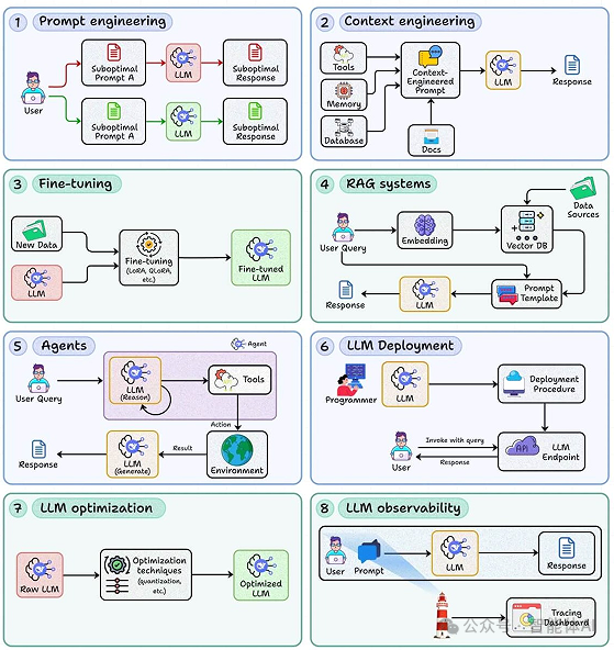 进阶者:引入"智能体(4)"与"微调(5)",把复杂任务跑通;并开始建设"部署(6)""优化(7)""可观测性(8)"。