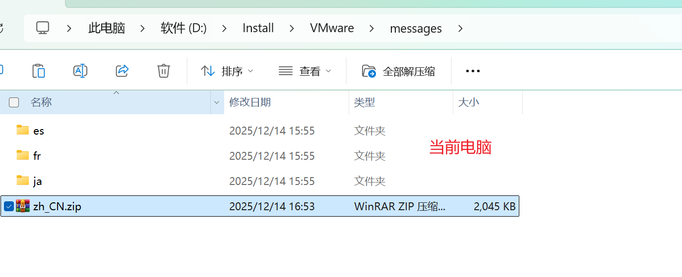中文语言包在安装目录下的messages\zh_CN目录中,我这里是复制另一台电脑的,将目录进行压缩,复制传送到当前电脑