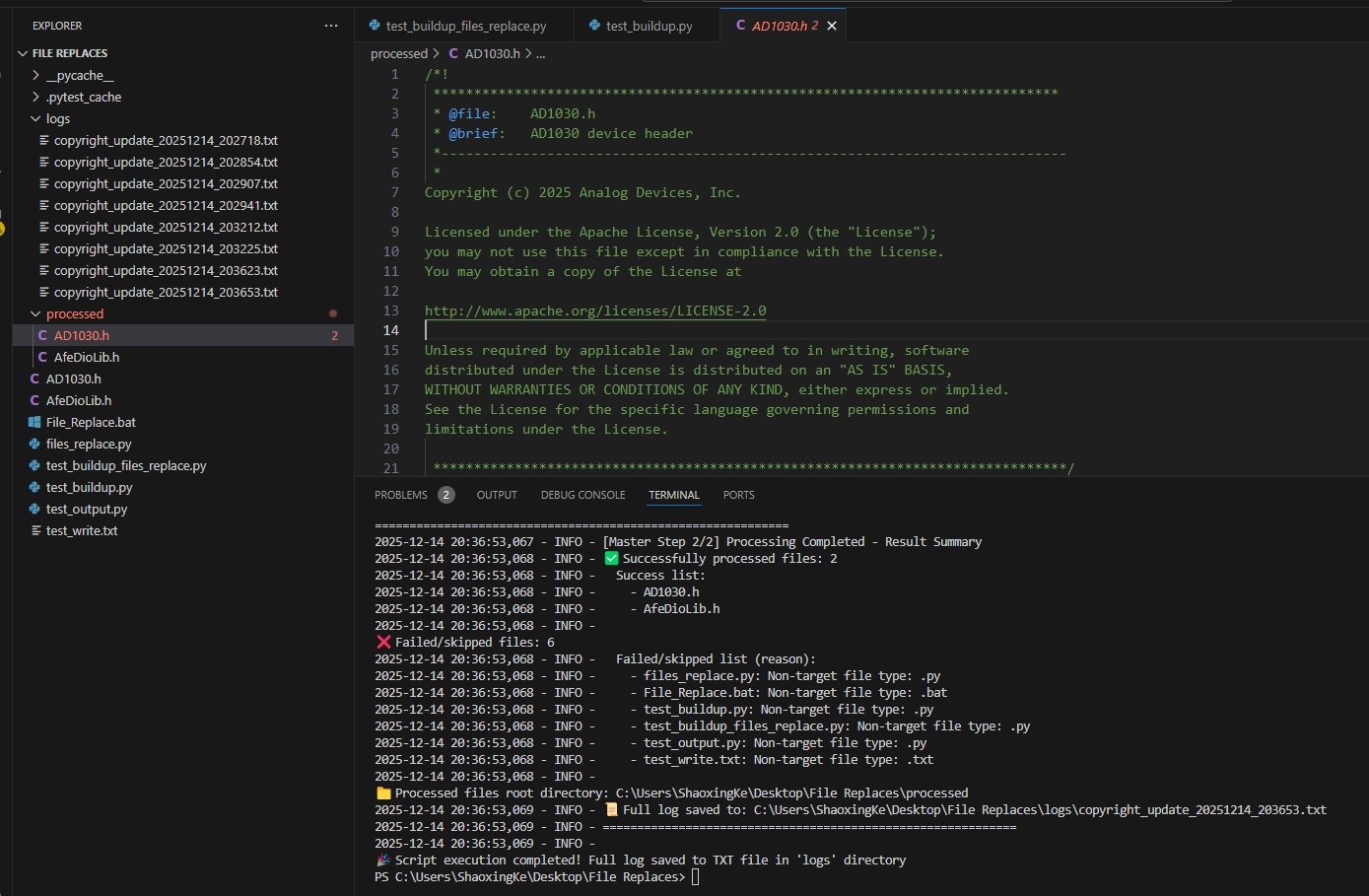 .c和.h后缀文件,自动跳过.txt、.py等其他格式文件及脚本自身。 - 精准文本替换:将文件中特定的旧版权声明块(2021年版本)完整替换为新的 Apache License 2.0 协议声明(2025年版本),严格保留文件其余内容不变。