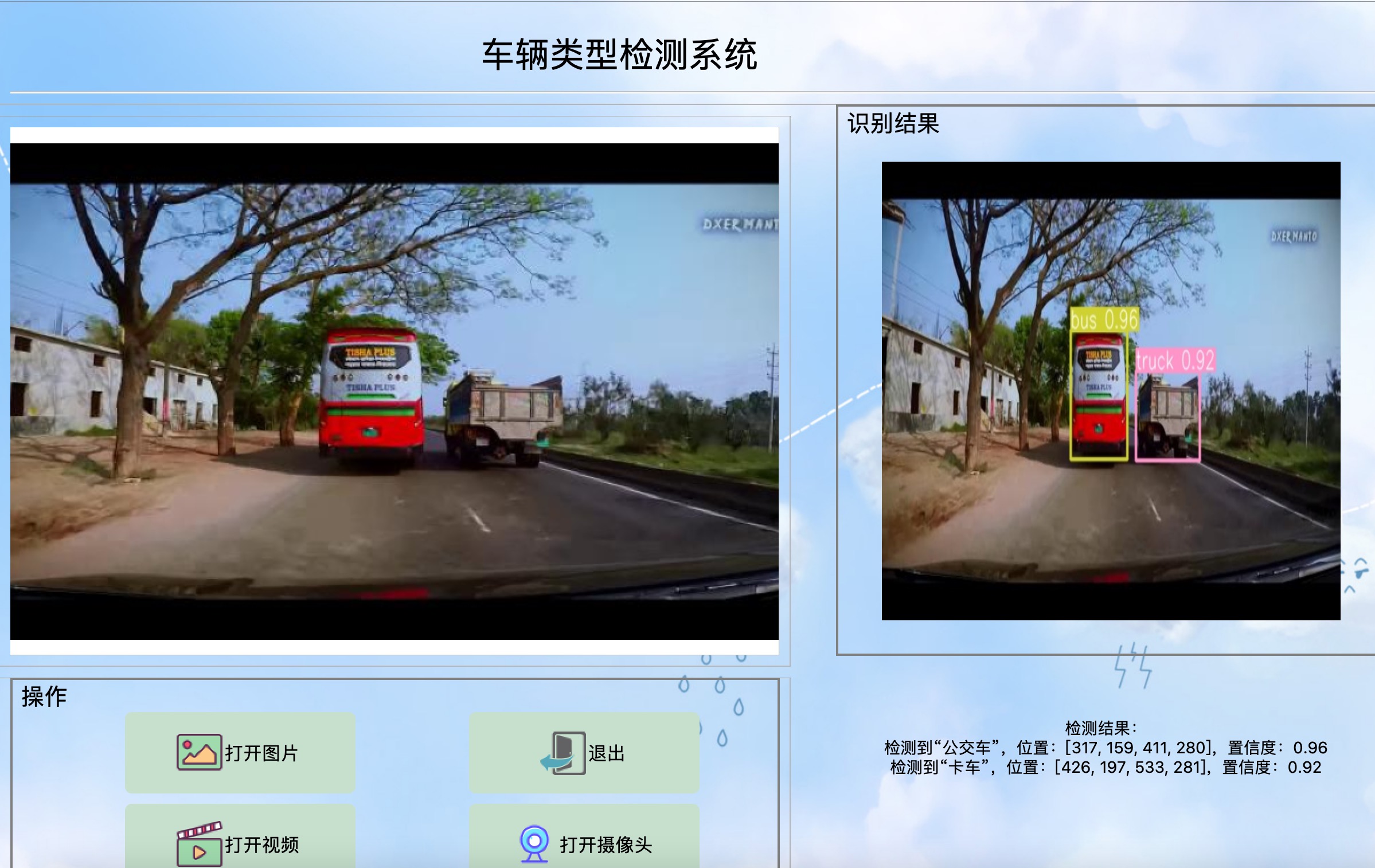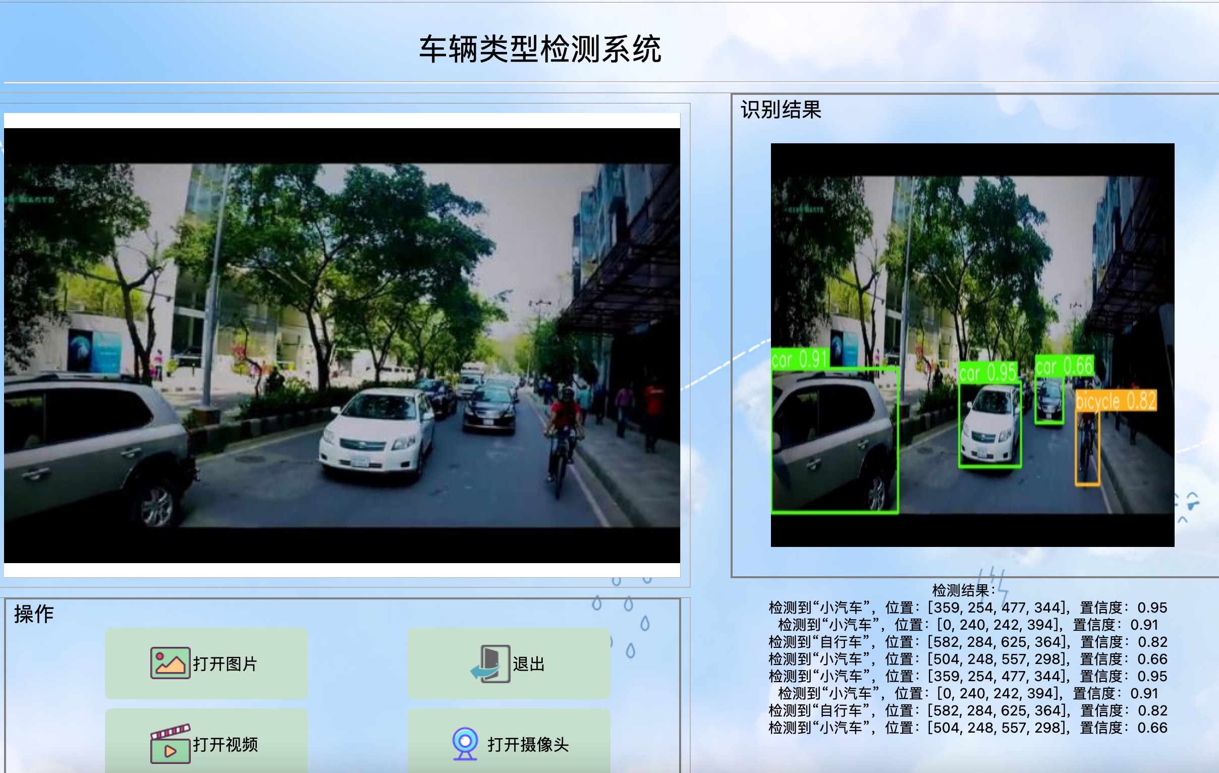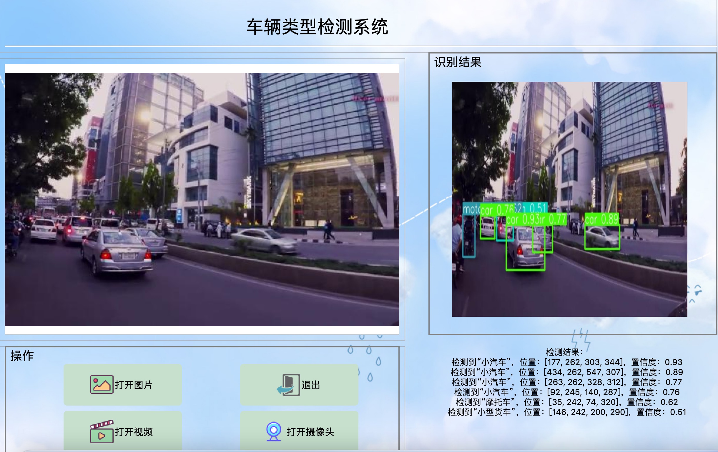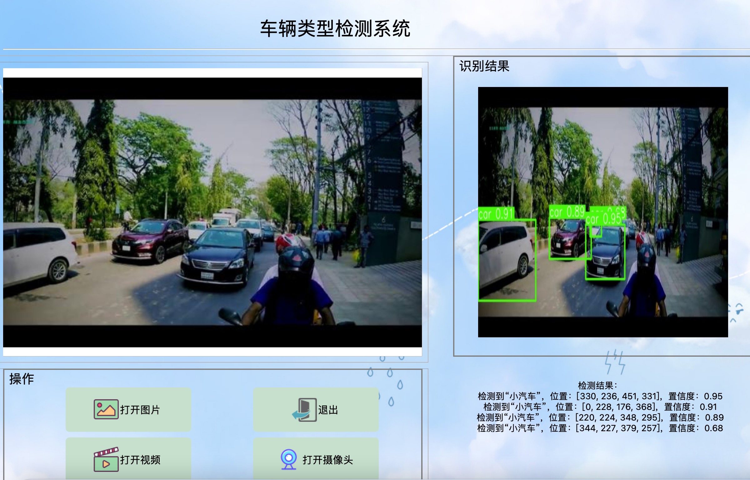 资源包含可视化的车辆类型检测系统,基于最新的YOLOv8训练的车辆类型检测模型,和基于PyQt5制作的可视化车辆类型检测系统,包含登陆页面、注册页面和检测页面,该系统可自动检测和识别图片或视频当中出现的21种车辆类型,包括:小汽车、公交车、小型公交车、SUV、货车、卡车、三轮车、摩托车、自行车、救护车、警车、垃圾车、手推车等,以及自动开启摄像头,进行车辆类型检测,并在图片上展示车辆的位置,以及输出车辆类型的类型、坐标和置信度。