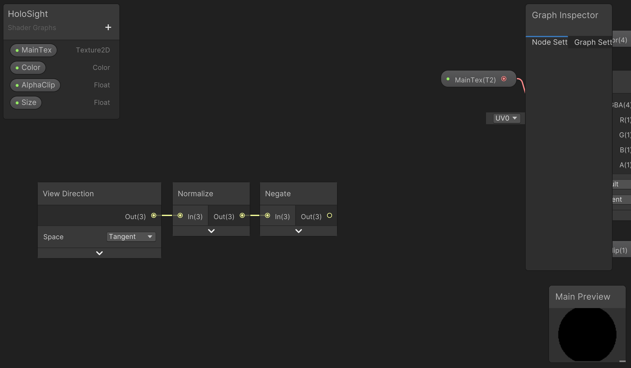 全息瞄准器采用激光全息术,使分划板图案作为平行光进入人眼。人眼在接收到平行光时,会认为光源在无限远处。因此,只要眼睛能看到瞄准镜内的分划,无论从哪个角度,该分划都会"粘附"在目标上。要模拟这个效果,需要在编辑界面中增加一个View Direction节点(获取摄像机看向物体的方向向量,Space选择Tangent方向意味着该方向是基于每个片元自身的法线方向来计算的),连接到Normalize节点进行归一化处理,然后再连接到到Negate(反转向量方向)节点,从而获取从表面到摄像机的视角,如下图。