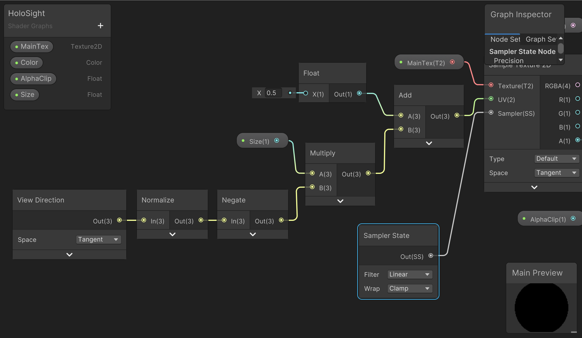 将Negate节点的输出和Size变量通过Multiply节点连接,以控制视角偏移的强度,再将其和Add节点连接,加上0.5,向向量各分量的取值范围从 [-1, 1]映射到 [-0.5, 1.5]区间,最后将其输入到Fragment节点的UV输入端口。增加一个Sampler State节点,设置Wrap为Clamp,将其连接到Fragment节点的Sampler端口(能防止当UV坐标超出常规的 [0, 1]范围时,纹理在边缘处出现不希望的重复),如下图。