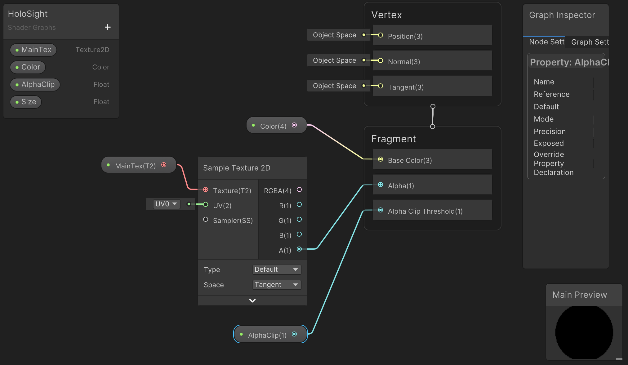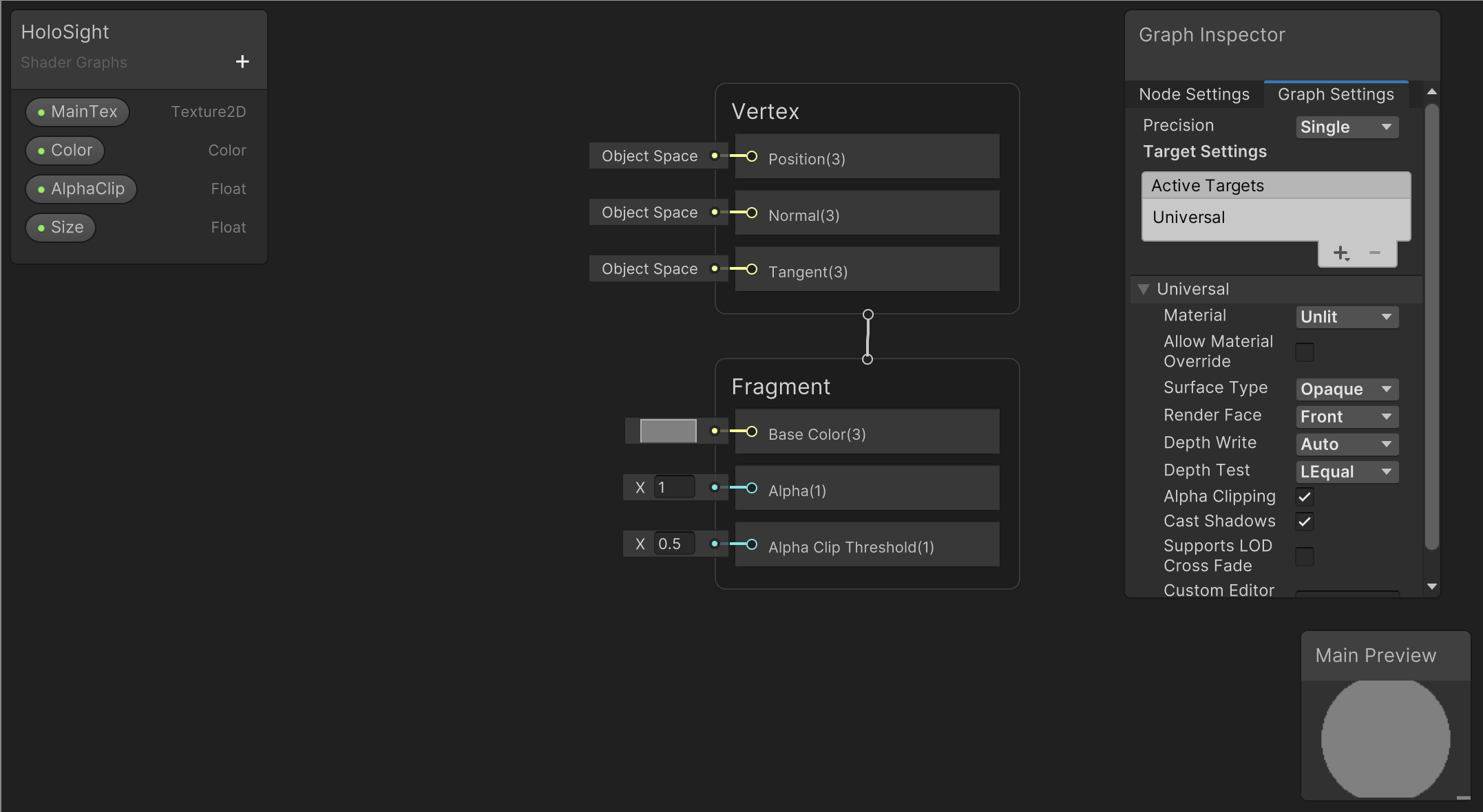 在Shader Graph的输入面板设置中,单击+号,新增一个类型为Texture2D的名为MainTex的输入变量,新增一个类型为Color的名为Color的变量,以及两个类型为Float的名为AlphaClip和Size的变量。单击Fragment节点,在Graph Settings设置面板中,单击Alpha Clipping选项,开启透明度裁剪功能,使得物体的某些部分透明。(即只叠加全息投影器的分划板,其他部分透明)。如下图。