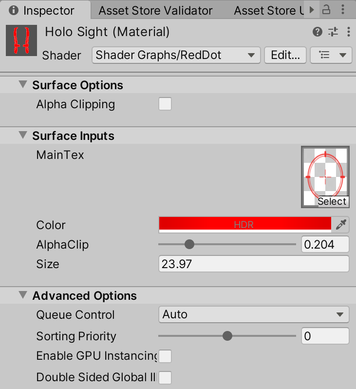 新建一个名为Holo Sight的Material,Shader选择刚才创建的Holo Sight Shader Graph,拖动分划板图片到MainTex中,设置Color为红色,如下图。
