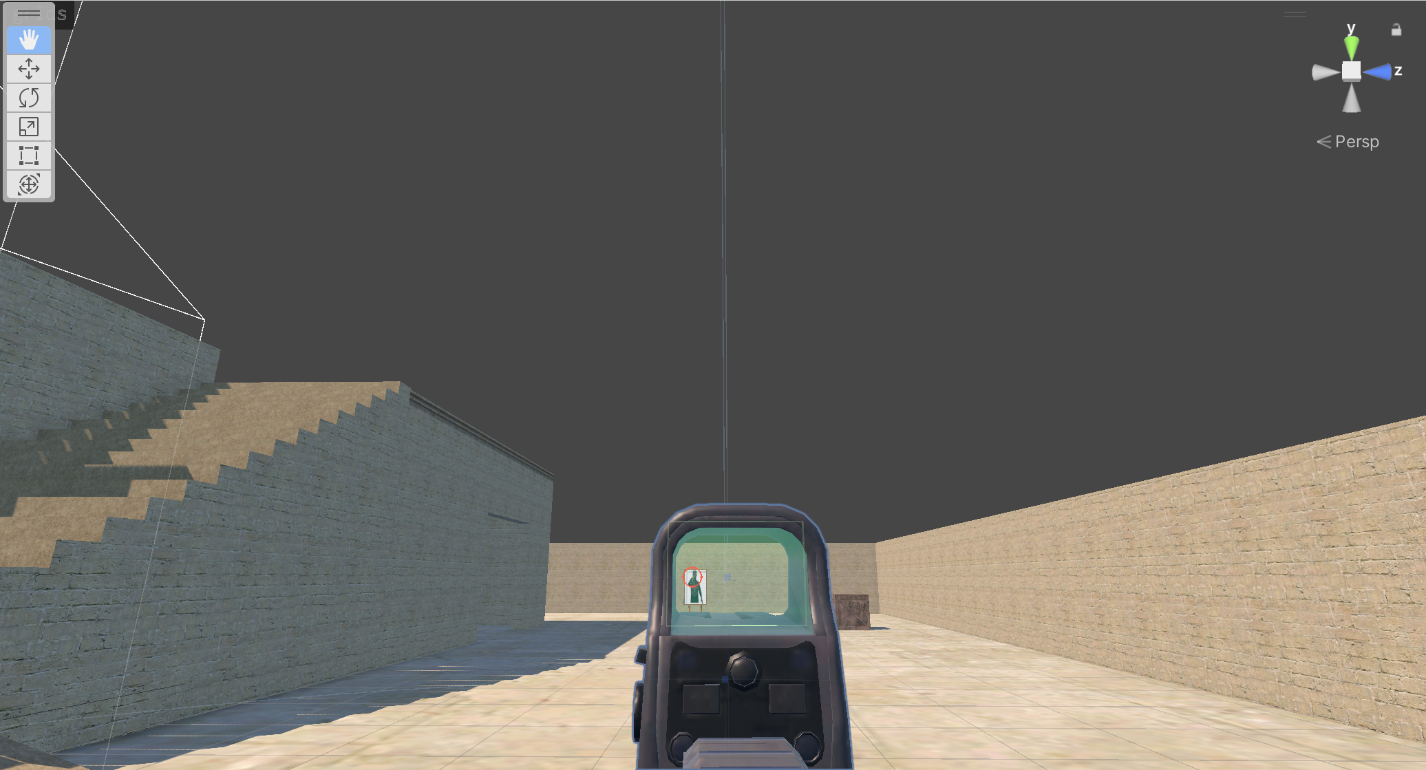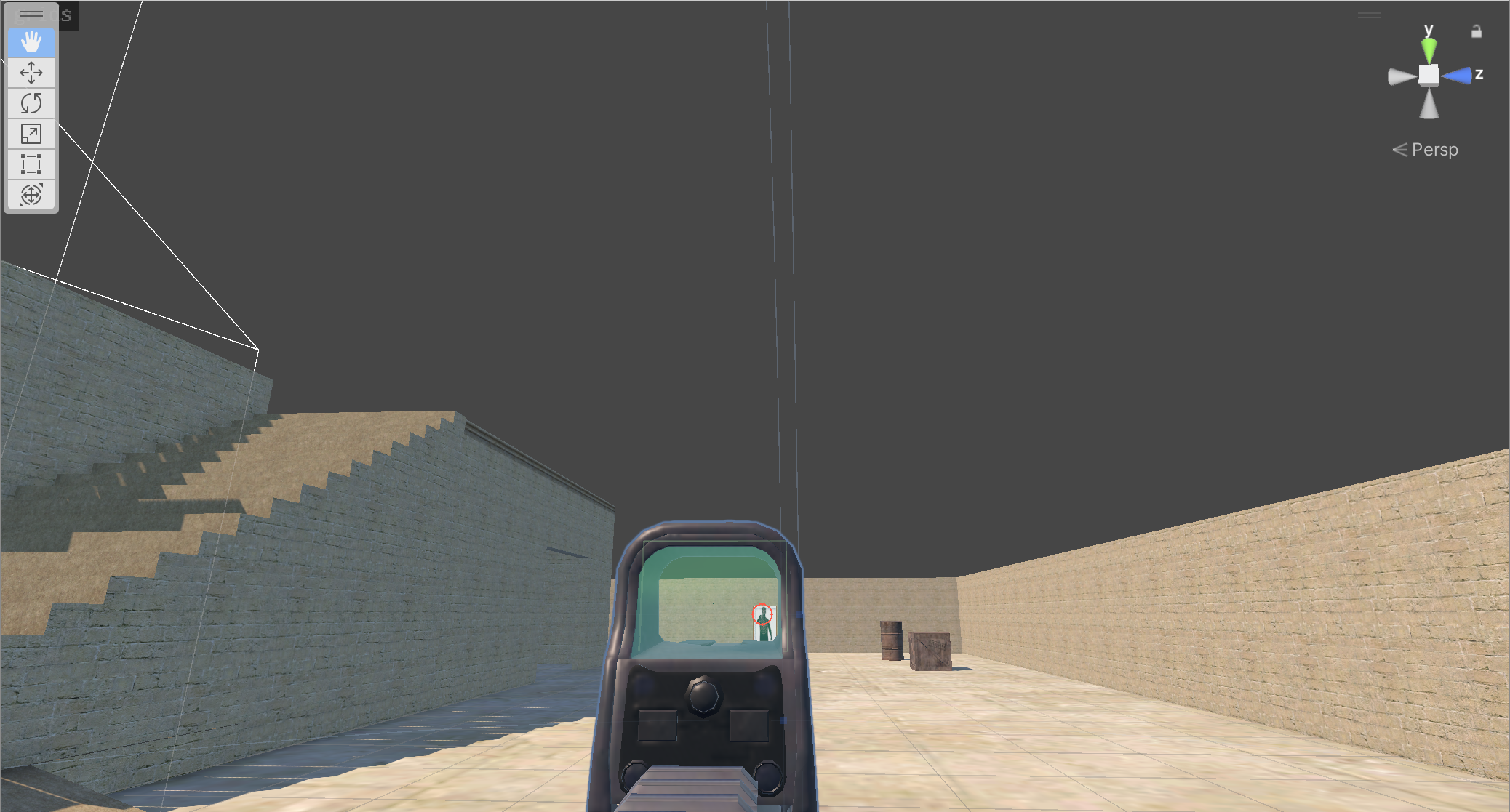 现在可以查看效果了。在场景中新增一个Cube物体,设置其材质为刚才创建的Holo Sight,可以看到分化板显示在了远处的物体上,移动摄像机的视角,分划板在物体上的位置没有变化,实现了无视差的效果。如下图。