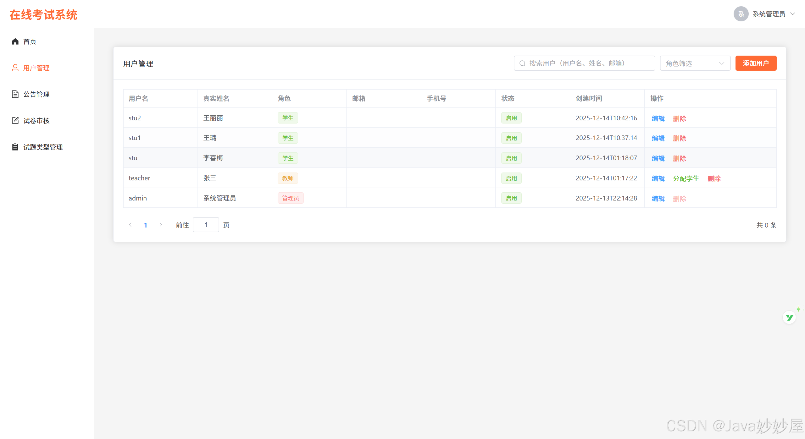 管理员用户管理:完整的用户CRUD功能,支持为教师批量分配学生