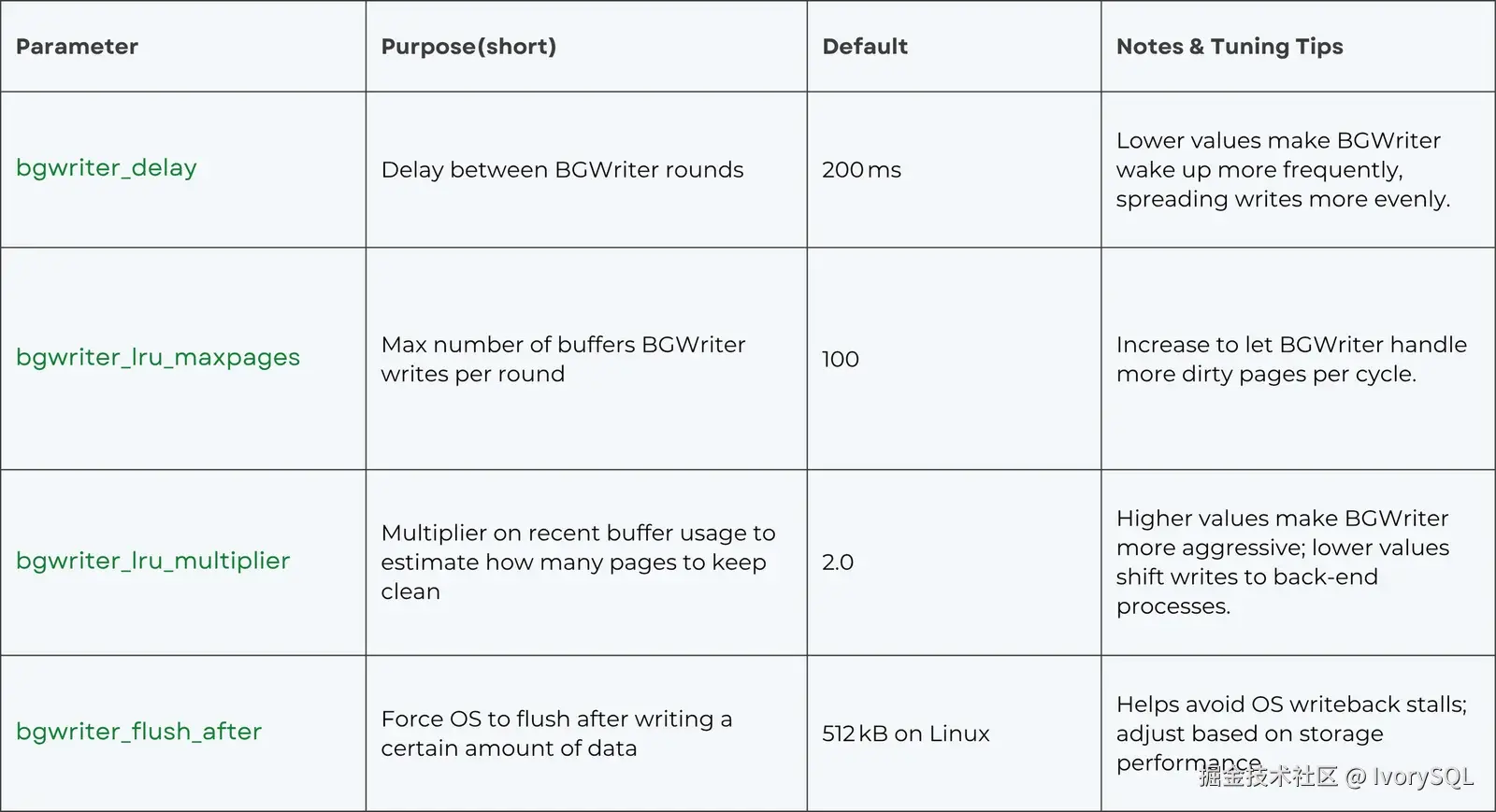 BGWriter 的主要配置参数(位于 postgresql.conf)包括: