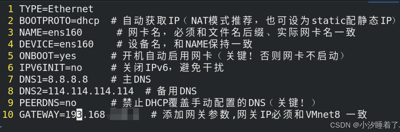 NAME=ens160 # 网卡名,必须和文件名后缀、实际网卡名一致