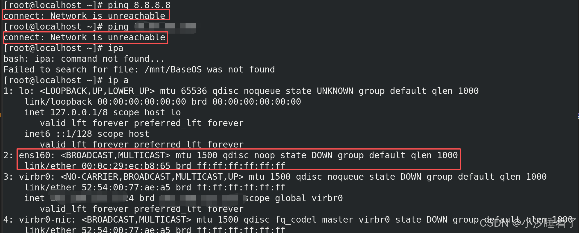 详情:redhat8没有IP地址,ping不通宿主机(但宿主机能ping通redhat8),ping不通外网。