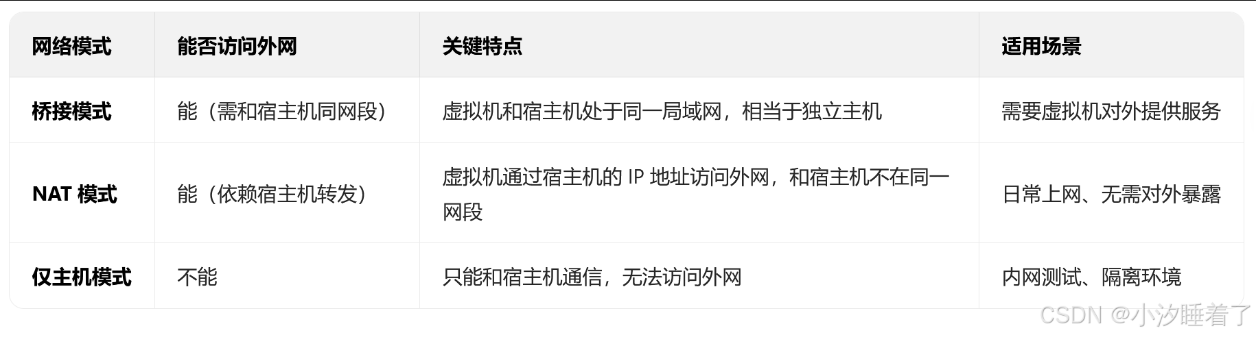 虚拟机的网络模式决定了它能否和宿主机、外网通信,常见的三种模式差异如下: