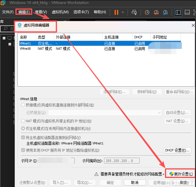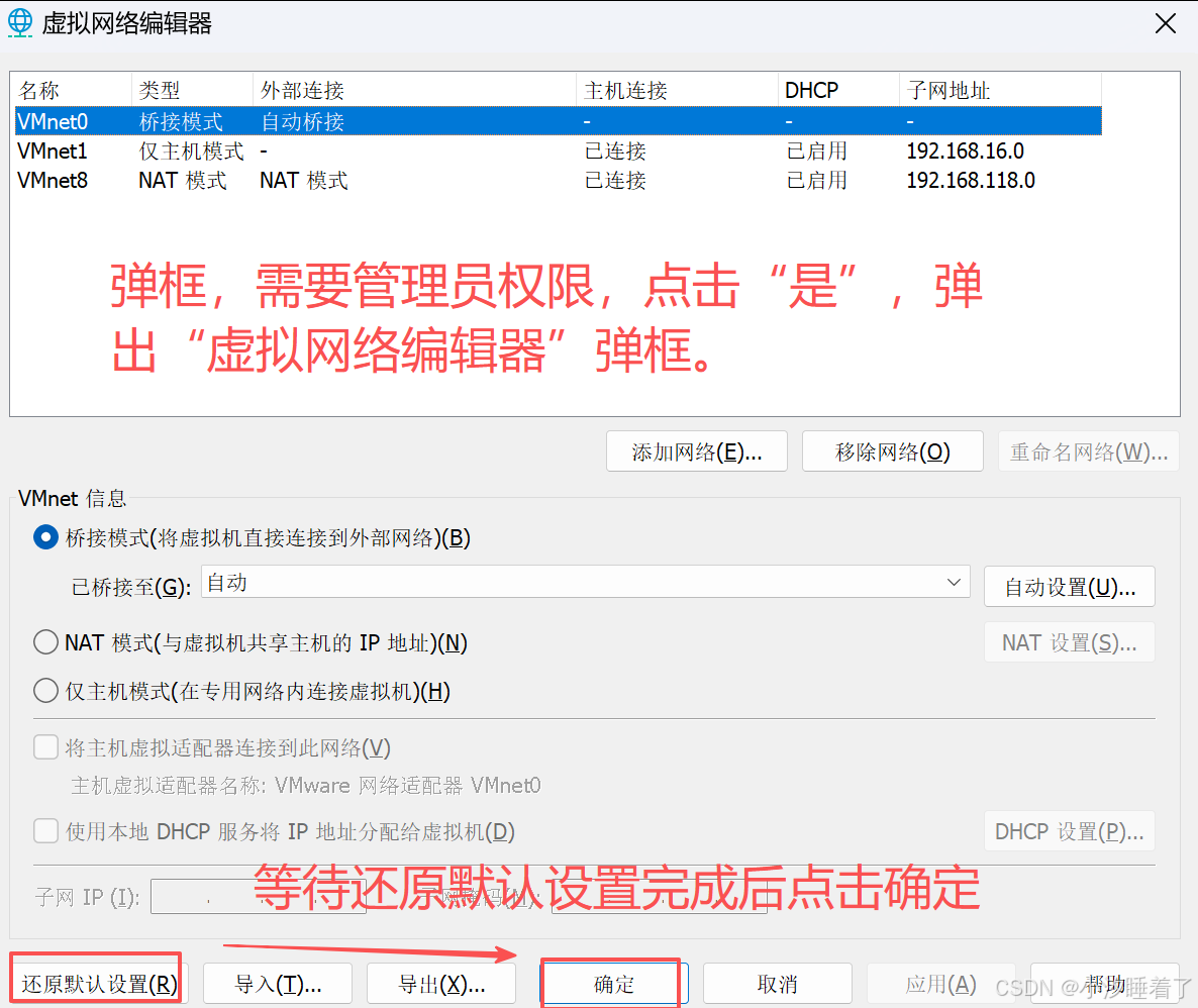 - 打开 VMware → 编辑 → 虚拟网络编辑器 → 点击 还原默认设置。