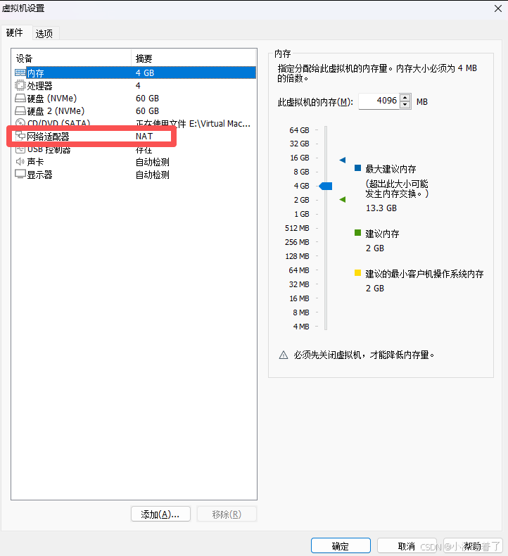 - 重新启动虚拟机,将虚拟机的网络适配器设置为 NAT 模式 (推荐)或 桥接模式。(如果前面已经排查过第一步,就不用再检查了)