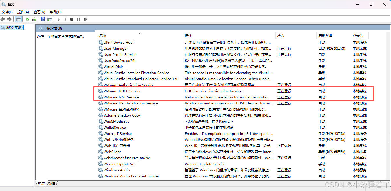 真正决定虚拟机能否上网的核心服务是 VMware DHCP Service (给虚拟机分配 IP)和 VMware NAT Service(NAT 模式下转发外网流量)。你需要重点检查这两个服务的状态。检查没问题就跑虚拟机重置。