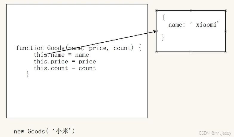 当代码执行new Goods('小米', 1999, 20)时,会先创建一个空对象,接着开始执行Goods函数,其中this会指向刚刚新建的空对象,当执行this.name = name时,相当于向这个新对象添加了name属性,并将传递过来的实参小米赋值给这个新属性。同理,函数继续给对象创建并赋值price、count属性。执行完函数后,会将这个新对象返回给xiaomi这个变量。