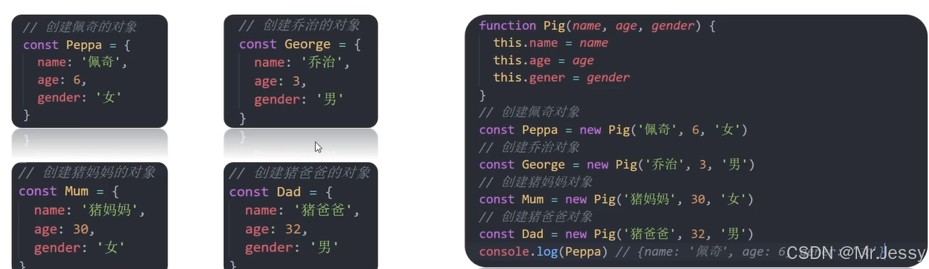 使用场景:我们常用的利用字面量创建对象的方法一次仅允许我们创建一个对象,当我们想要创建多个拥有相同属性的不同对象时,手动创建会非常麻烦。比如,我们创建了'佩奇'这个对象,如果我们要继续创建'乔治'这一对象,还需要重新写一遍。
