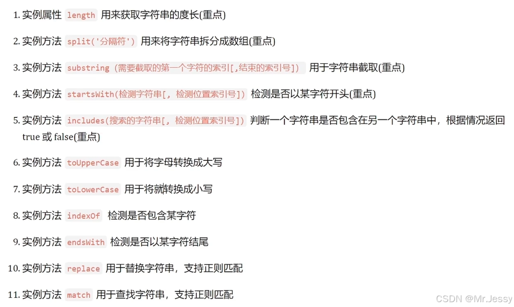 startsWith(检测字符串[, 检测位置索引号])检测是否以某字符开头(重点) - 实例方法