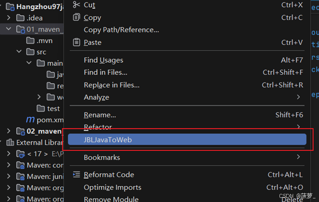 刷新Maven工程:右键模块→"Maven→Reload Project",若webapp目录出现小蓝点,说明Web工程配置成功。