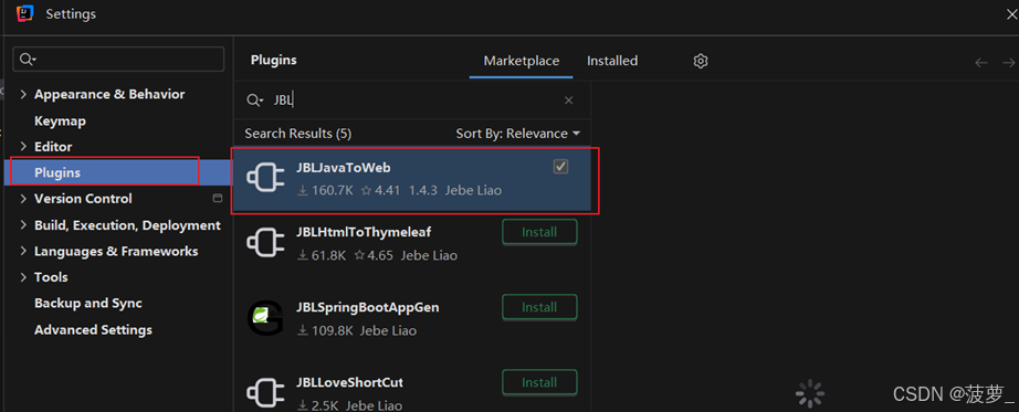 安装JBLJavaToWeb插件:打开IDEA→"File→Settings→Plugins",搜索"JBLJavaToWeb",点击"Install"并重启IDEA。