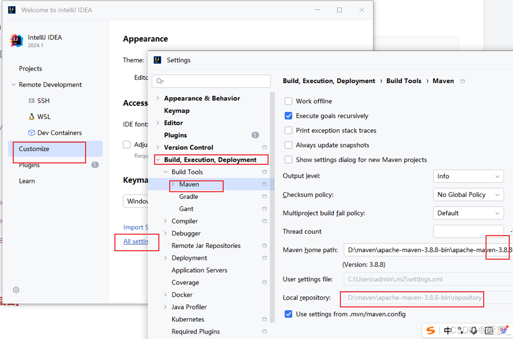 Maven home path:选择"Local",并指定本地Maven的安装根路径(如"D:\DevTools\maven-3.8.8"),避免使用IDEA自带的Maven版本,确保环境一致性。