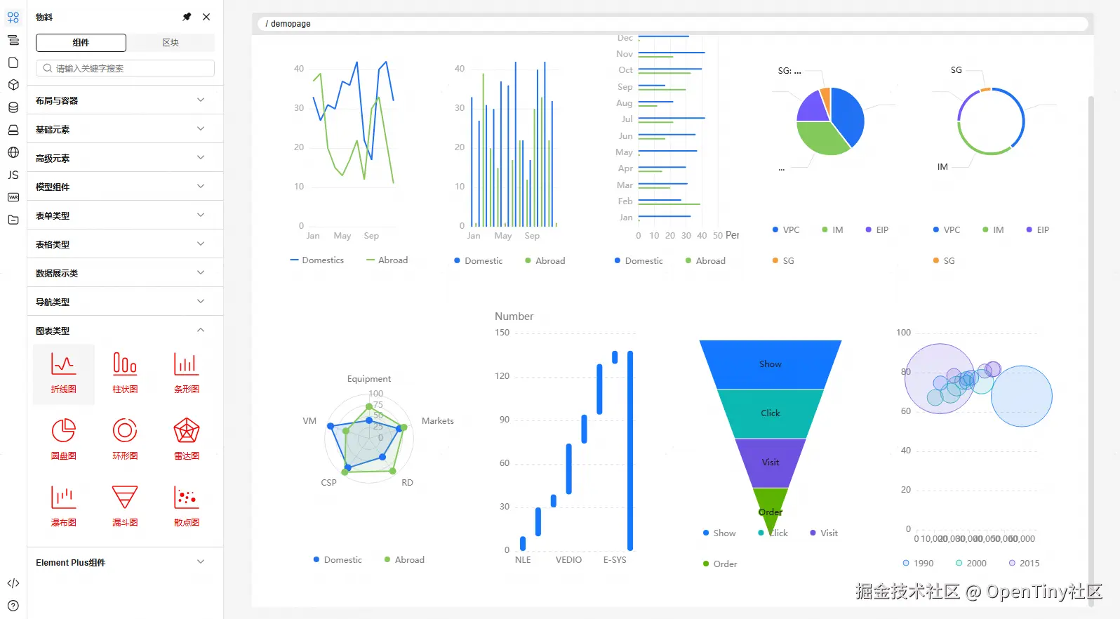 物料面板新增TinyVue图表组件,主要包括折线图、柱状图、条形图、圆盘图、环形图、雷达图、瀑布图、漏斗图、散点图 等