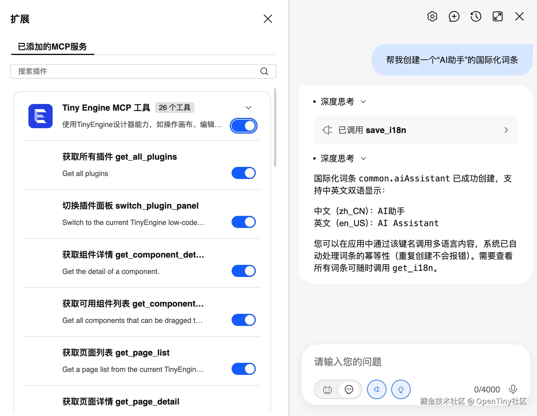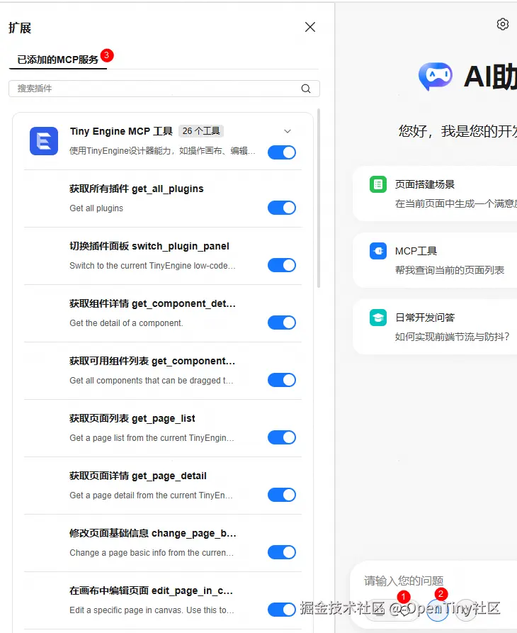 AI 助手除了新增的搭建模式,原有的对话模式也进行了增强,增加了若干个插件的 mcp 工具: