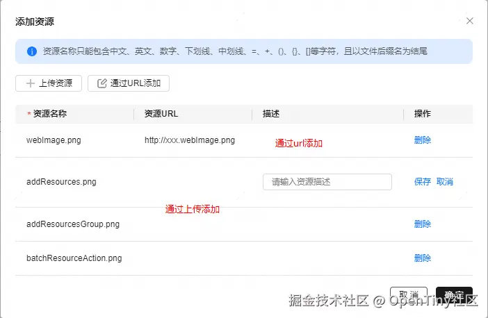 添加资源分为两种方式,输入URL和名称添加网络资源,上传图片或图标资源。 其中资源名称必填,通过url添加的话url也必填,如果是上传的,则不能输入url,支持上传png、jpg、svg文件,支持批量上传