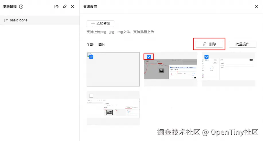 也支持批量操作,点击批量操作后,出现删除图标(后续还会扩展其他批量操作),且资源变为可多选的状态
