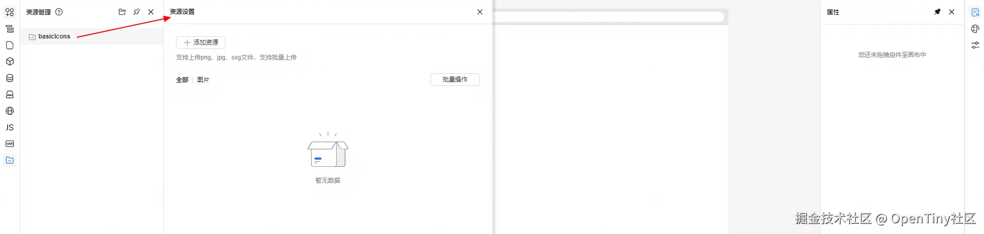 在应用开发中,通常会需要引用图片等资源,资源管理插件主要满足这类场景需求,可以上传项目中用到的静态资源,在编排页面或AI生成页面时引用(当前仅支持图片格式附件)。