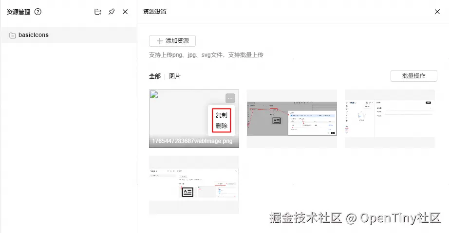 已添加资源的管理,hover时显示名称,操作包括复制和删除,复制是复制添加完成后在用户服务器上的url地址