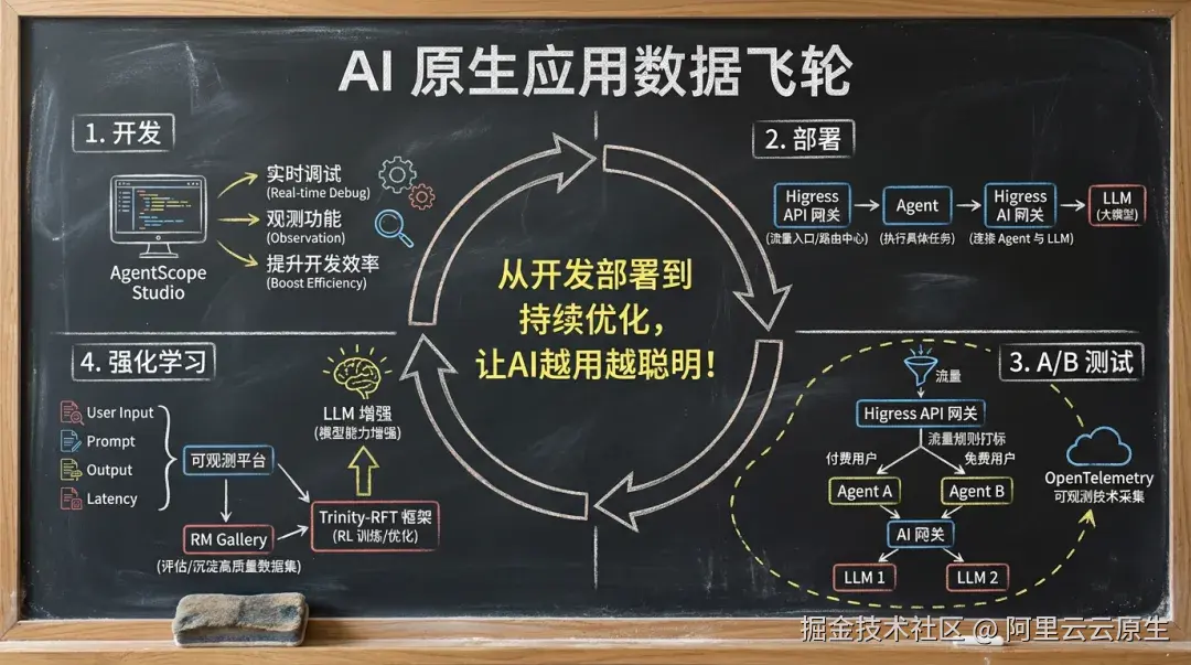 面对这一挑战,AgentScope 提供了 Studio、RM Gallery 和 Trinity-RFT 等一系列生态工具,结合 Higress AI 网关和可观测系统,您可以快速实践 AI 原生应用数据飞轮。