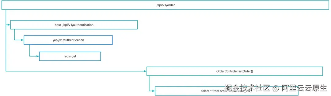 在可观测领域,我们一般把调用链路上一次关键的操作称为一条 Span(跨度) [ 8] ,一条调用链一般由一组树状结构的 Span 组成。在可观测前端的帮助下,我们可以把同属于一条调用链的 Span 召回,并根据父子关系(也就是调用关系)以及发生时间渲染为下图所示的瀑布图,以此来帮助我们了解一条链路发生的所有关键操作以及调用关系。