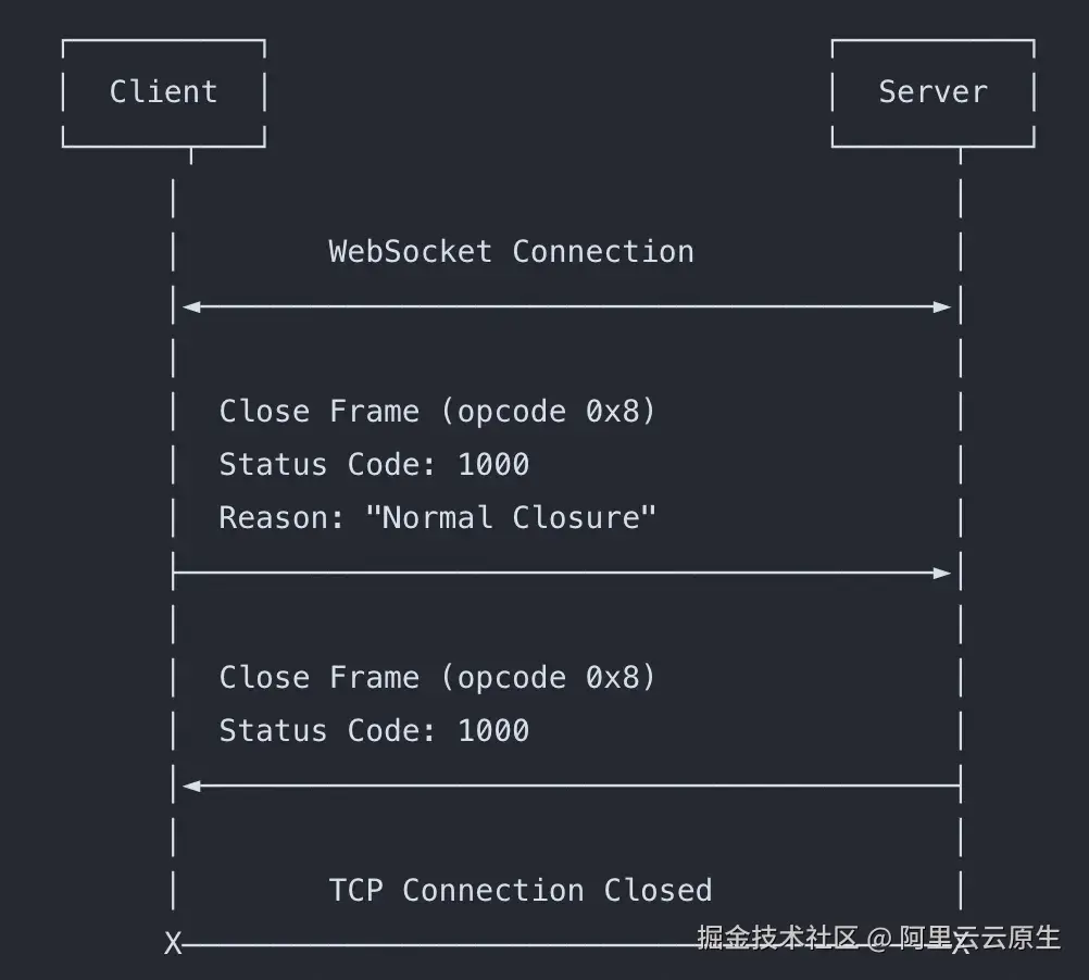 当客户端或服务端某一方认为连接可以关闭时,会向对端发送一个关闭帧(是控制帧的一种),对端收到关闭帧后会尽快发送另一个关闭帧作为响应。发送完关闭帧后,该端不应该再发送任何数据帧。双方交换完关闭帧后,TCP 连接将关闭。