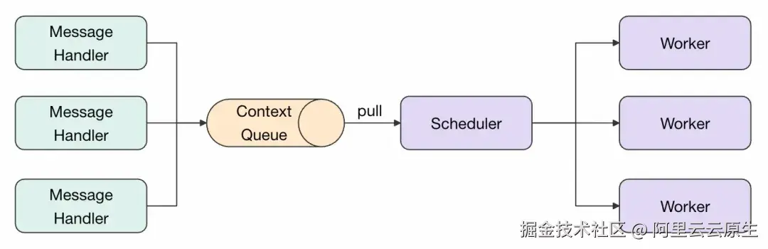 在 WebSocket 应用中,为了提高连接利用率,两端也常用异步的方式来解耦消息接收过程与处理过程,以下是一个典型的异步消息处理架构。在这个过程中,消息有可能会直接被提交到线程池,也有可能存放在一个进程内的队列,甚至直接写入 Redis 等外部存储。这种灵活多变的异步方式也给链路上下文的进程内透传带来了困难,非常容易出现断链问题。